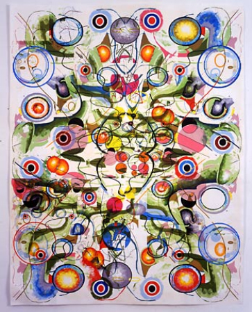 AY: You use the technology to setup ironic distancing on many levels. For example, it's a painting that's not painted; it's hand made yet it's printed by a machine; it's a "digital" and seemingly reproducible work of art yet it is in fact a unique object. Can you talk about how these relationships contribute to the subject in your work? TM: The cartoony hand is “me” but the work plays with various influences: Abstract Expressionism, Japanese animation, early computer graphics. The self-consciously baroque style makes fun of the meandering purposelessness of nth-generation abstraction, or perhaps I'm trying to create the worst nightmare of people who never liked abstraction, because they see it as too aestheticized or bourgeois. I think there's a relationship in the work between classic modernist painting, made in an era when people were talking about exciting new discoveries such as radio and X-rays, and the early years of home computing, when a new wave of utopian talk filled the air. I like the idea of going back to both Cubism and MacPaint but then making something that's more "wised up" and current.